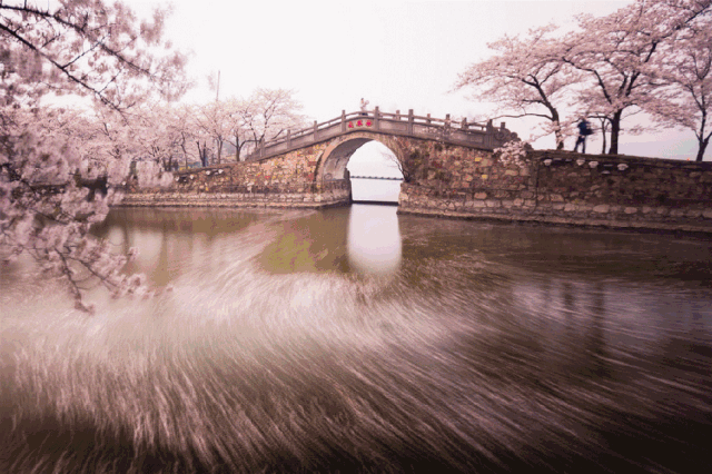 这儿是赏樱风情最浓的地方。一泓水池,一座石桥,樱花映衬,小桥流水,你总能看到摄影师在这取景。