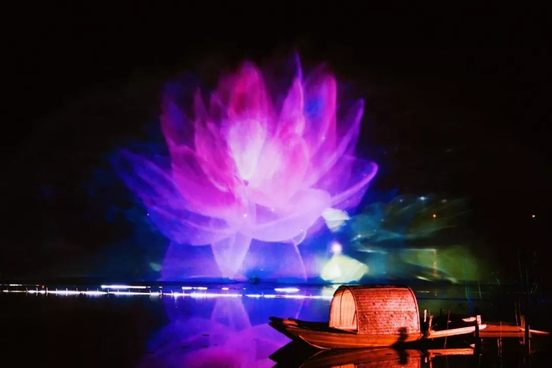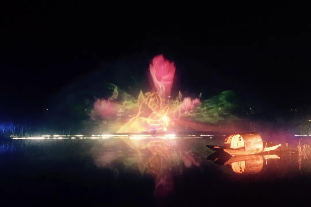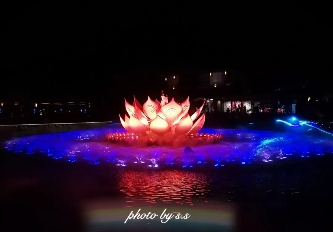 灯光流转,烟雾缭绕,在无垢无净的禅境山水中,两页扁舟停泊,借之现代数字多媒体技术,水幕上一出出美轮美奂、诗意空灵,生动演绎了禅宗的法脉源流。
